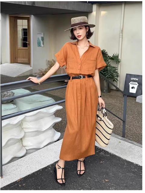 N1004Q 夏季盐系轻熟风气质长裙法式polo领工装短袖衬衫式连衣裙