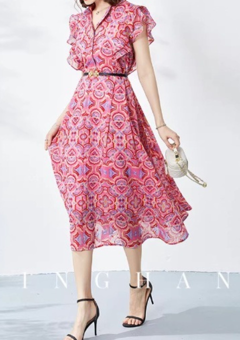 N1006Q蚕丝V领腰部抽褶印花连衣裙女高级感裙子夏新品